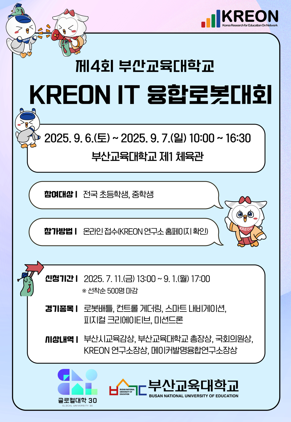 부산교육대학교 KREON연구소 주최로 9. 6.(토)~7.(일) 2일간 KREON IT융합로봇대회를 개최합니다. 전국의 많은 초등학생, 중학생이 참가하여 그동안 갈고 닦은 실력을 발휘하는 의미 있는 대회가 되기를 기원합니다.