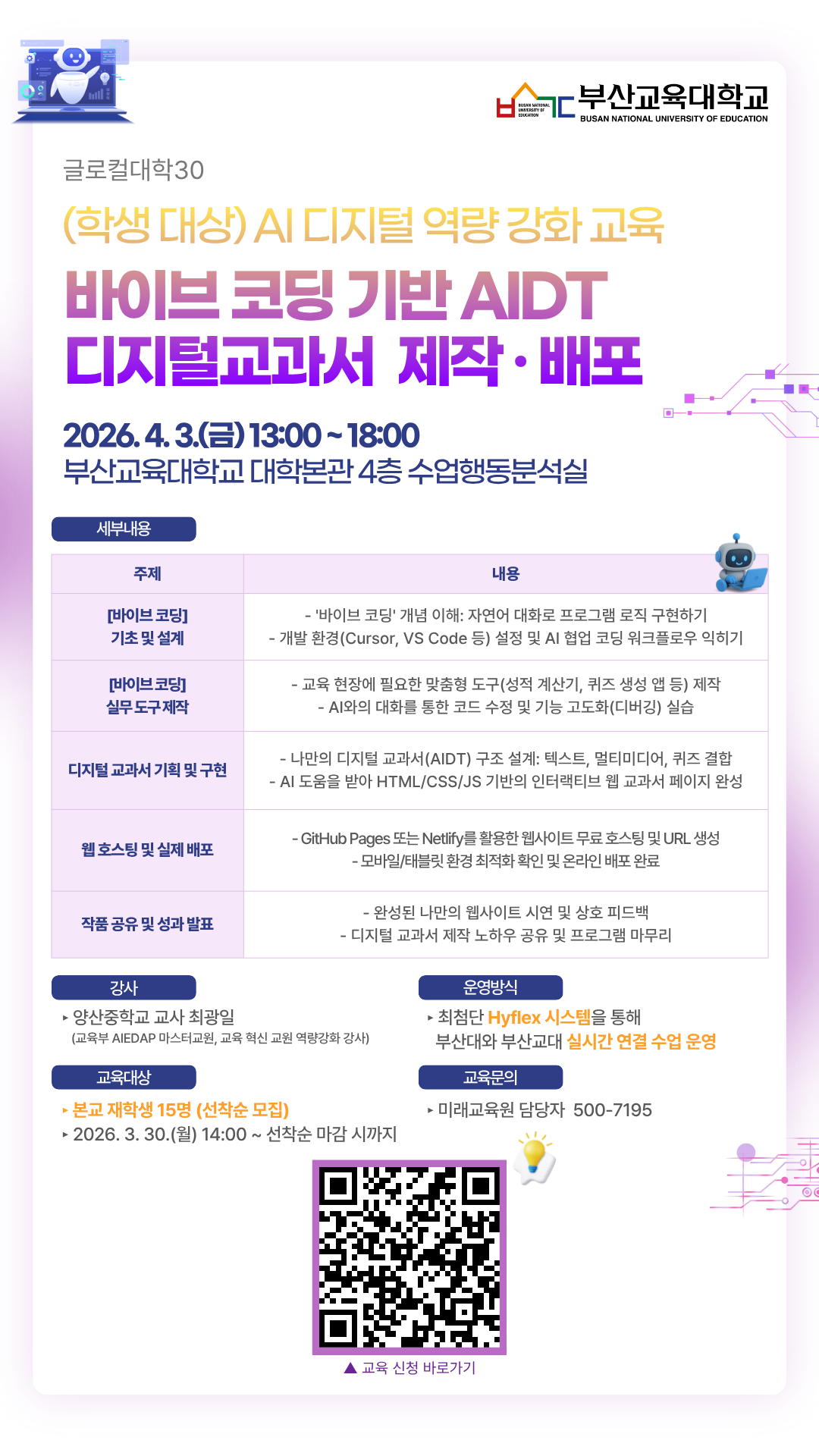 - 본 특강은 부산대학교와 함께 진행하는 실시간 하이브리드(Zoom) 교육입니다. 부산교대 학생들은 지정된 강의실에 모여 스크린을 통해 수강 및 실습을 진행합니다.